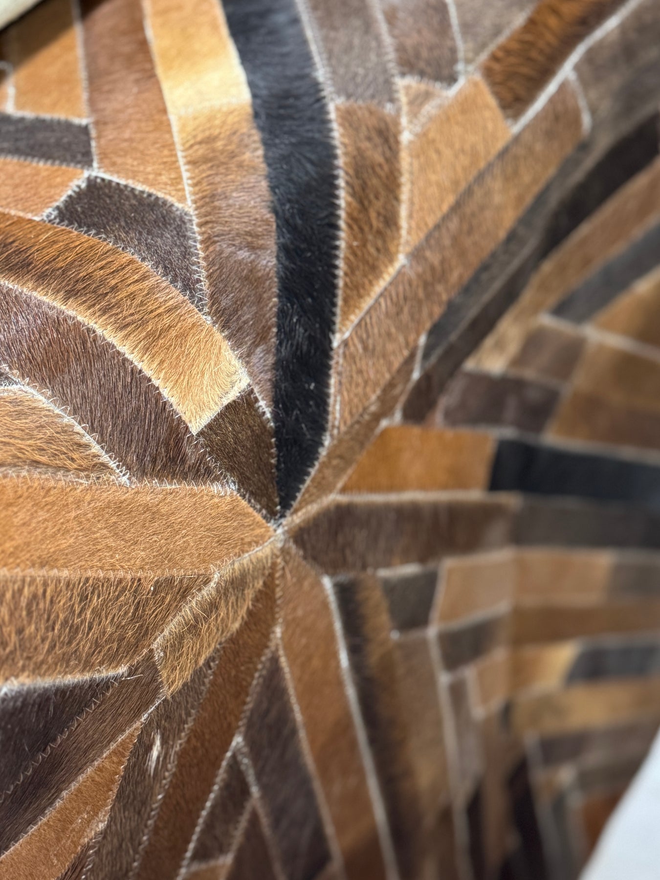 Every rug is carefully chosen and sewn by hand, creating a unique work of art just for you! Size: 5x5 feet. The rug you receive will look exactly like the one shown. Enjoy a lively and distinctive look made by combining various cowhide patches.