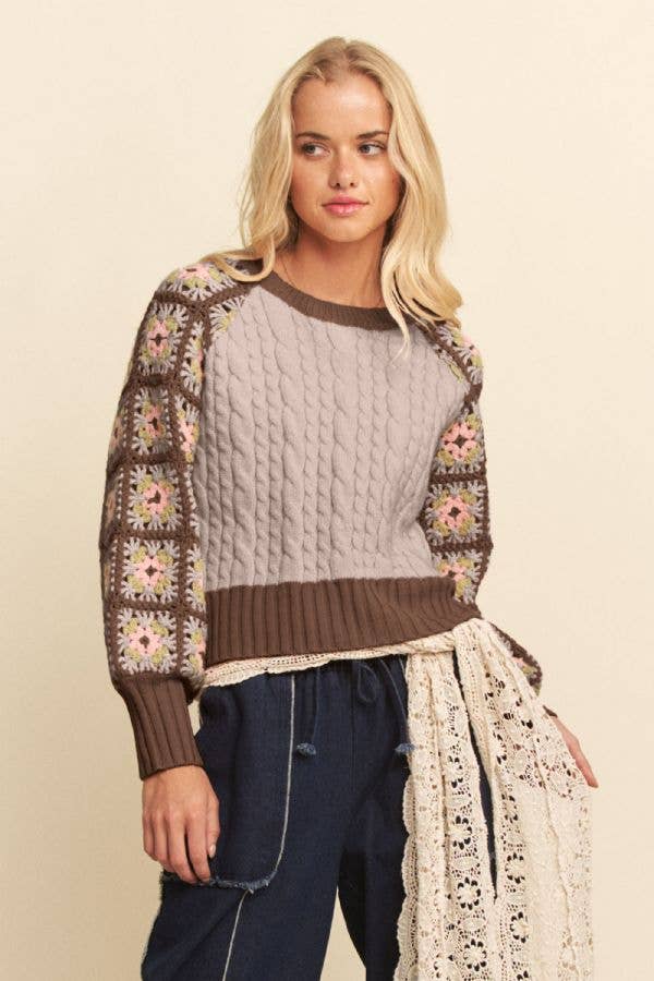 Boho Bloom Crochet Sleeve Cable Knit Sweater - Mocha/Mauve