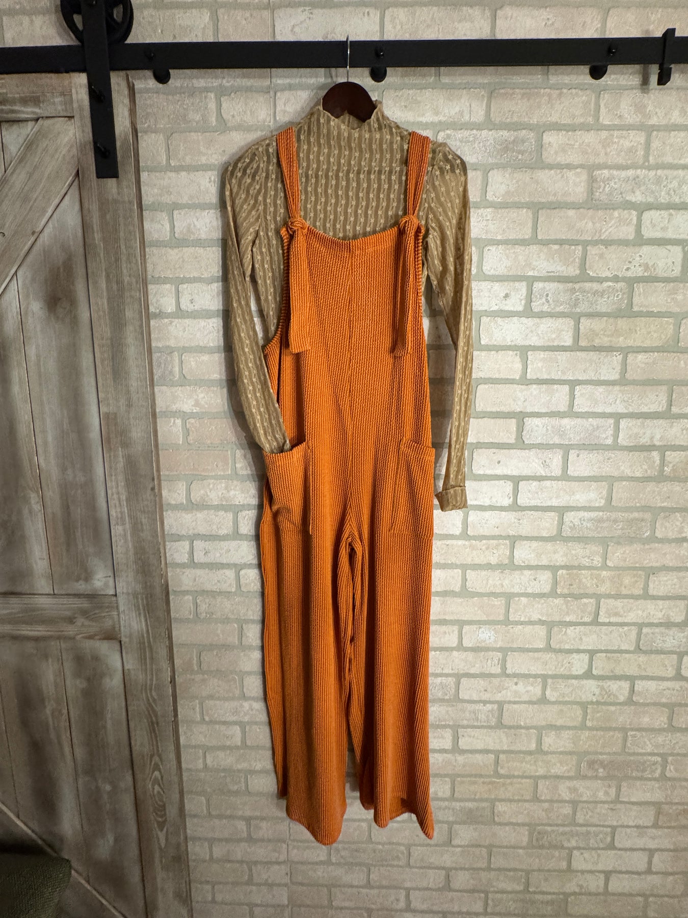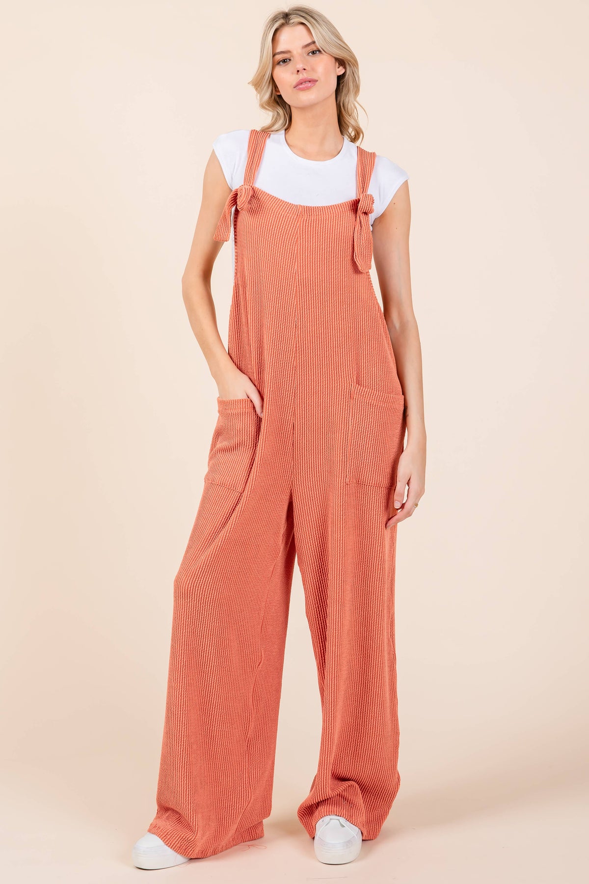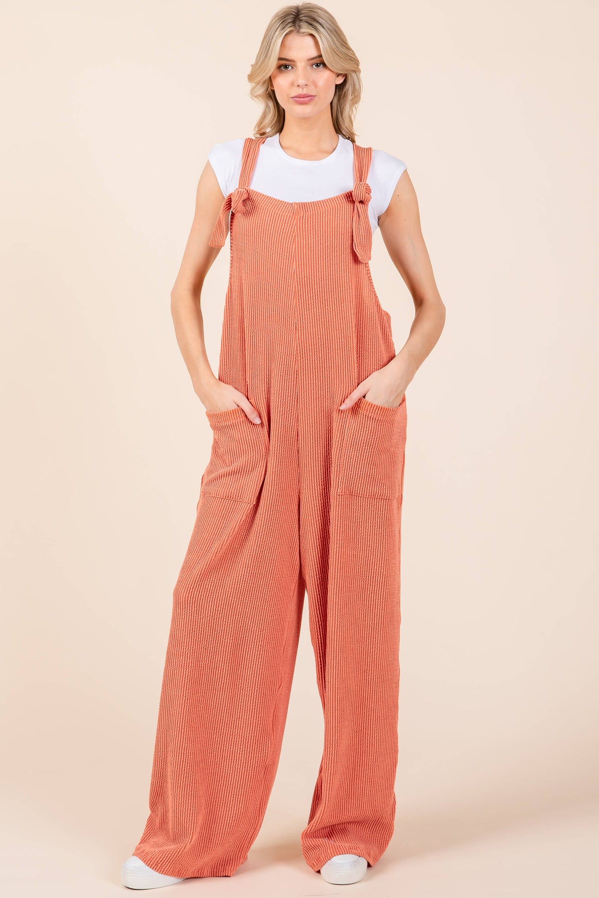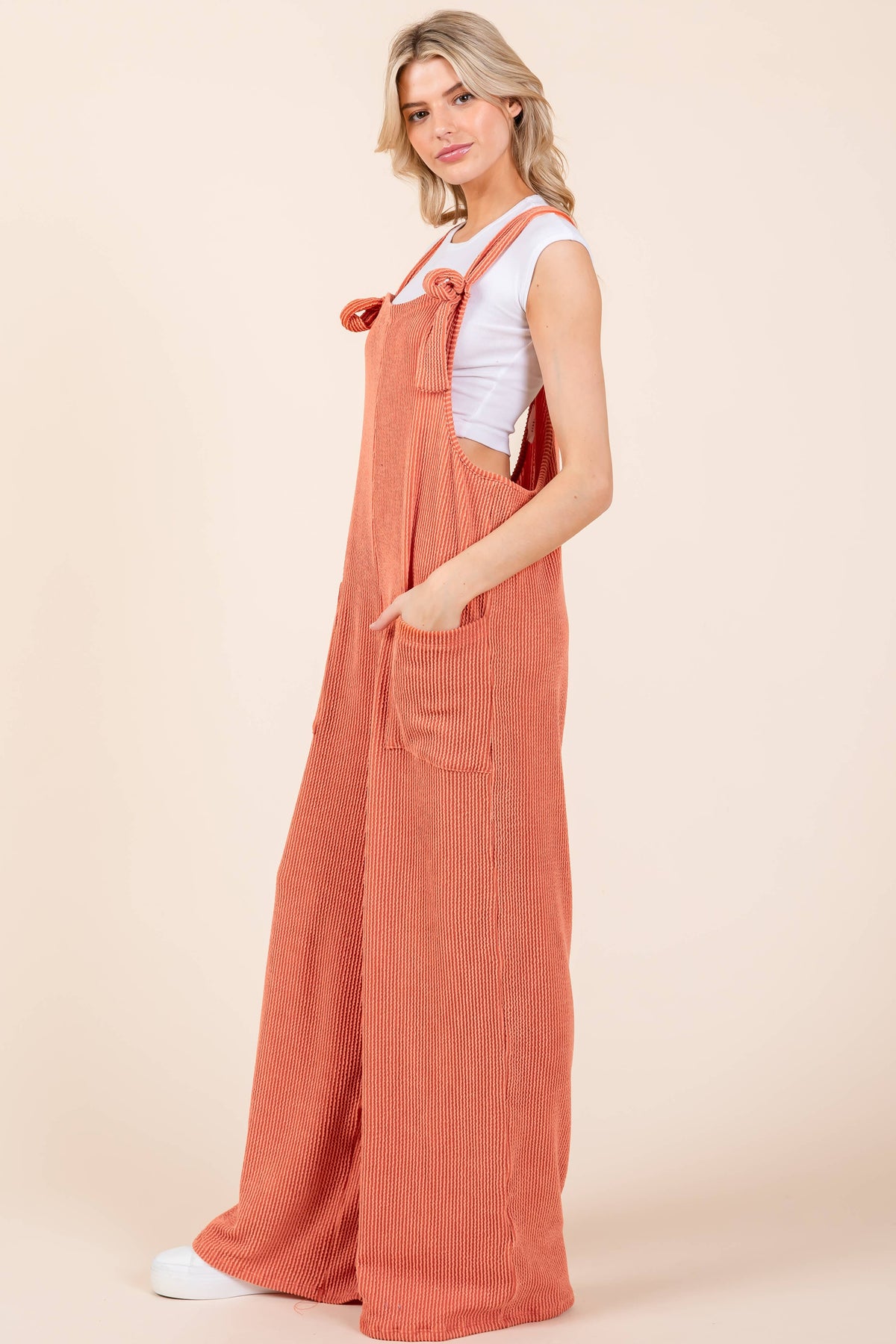 Slip into this playful rib knit wide-leg jumpsuit, crafted with knotted adjustable shoulder straps and roomy front patch pockets. Its relaxed fit makes layering a breeze, while the soft, comfy fabric keeps you feeling cozy all day. Perfect for adding a fun, casual vibe to your everyday style!