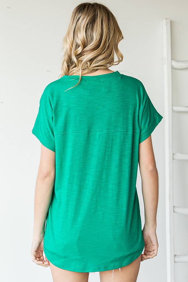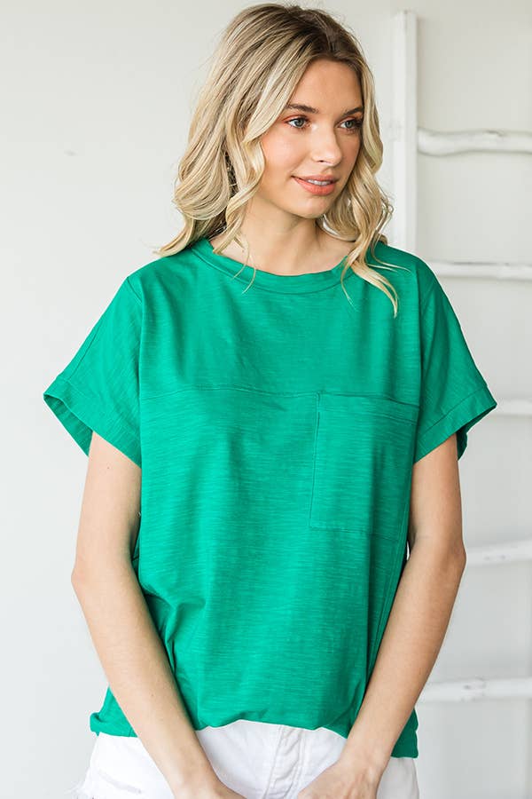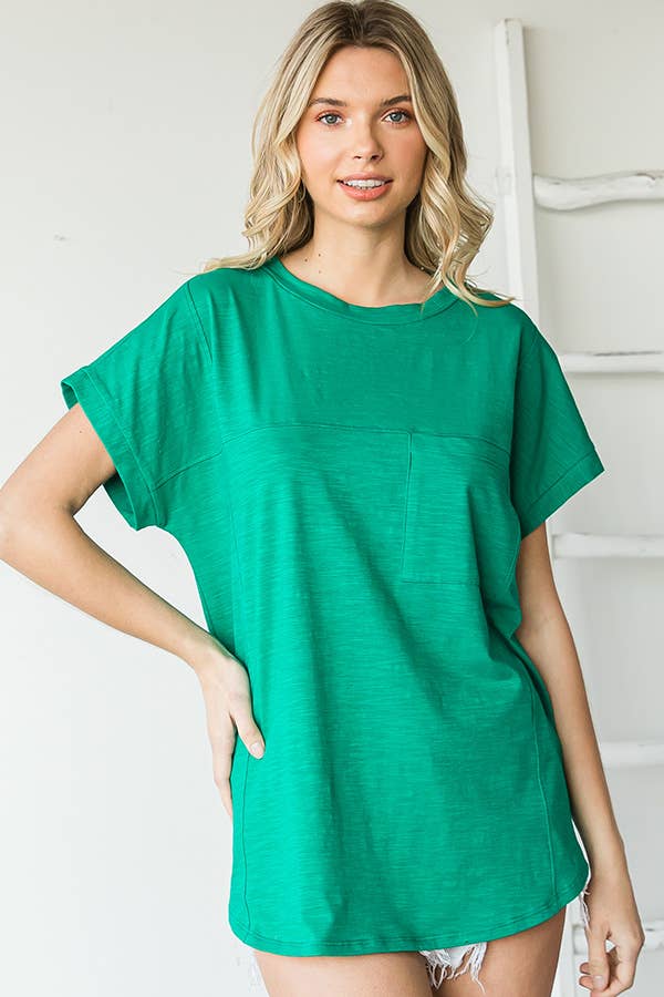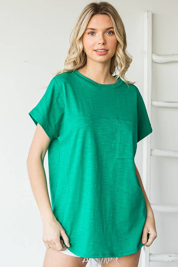 This playful green tee brings effortless style with its solid color slub fabric and relaxed oversized fit. Featuring a handy pocket and a flattering round neckline, it’s perfect for casual days when comfort meets cool. The short sleeves and round hem add a breezy touch, making it your go-to top for easy, everyday fun.