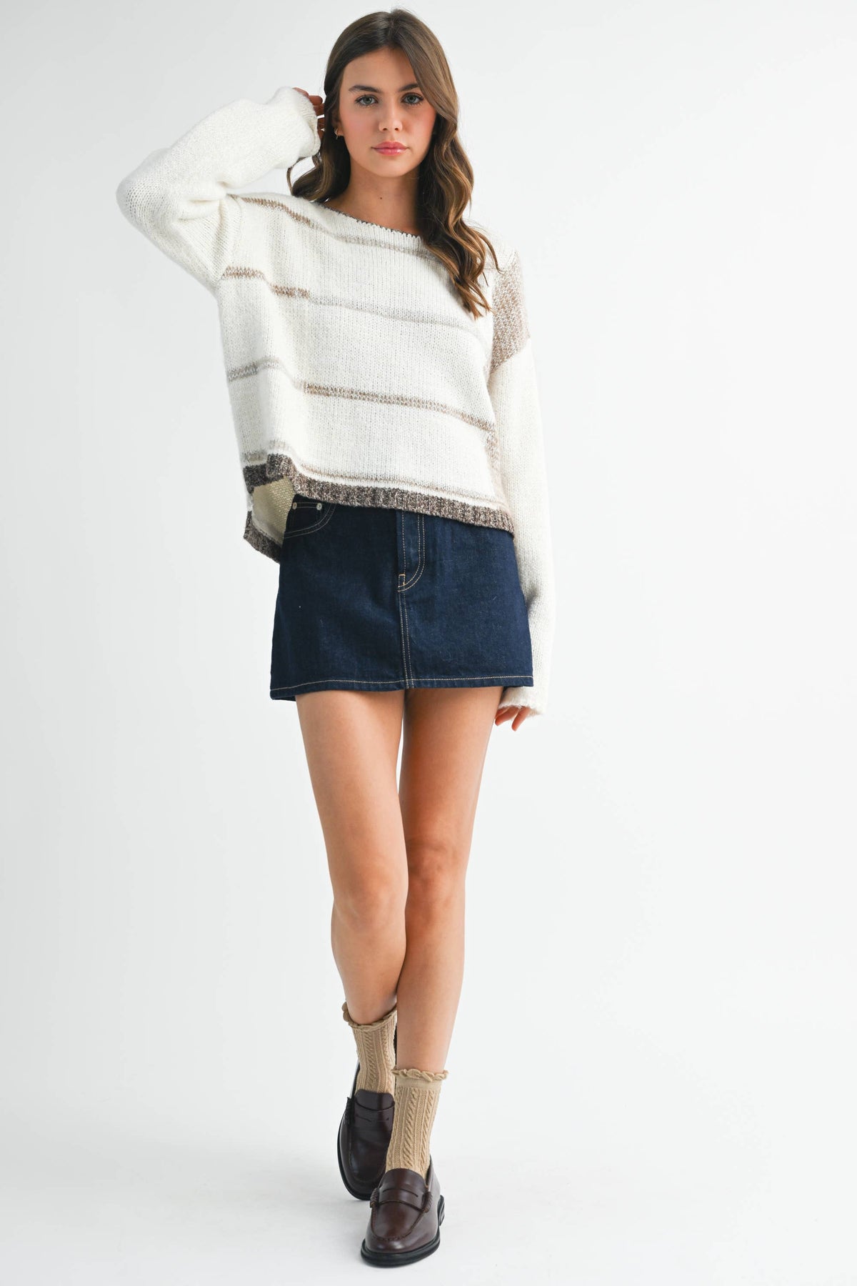 Our Mona Sweater makes a serious impact based on the stripe and colorblock alone. She's slightly cropped length knitted in the softest yarn that feels like a cloud against your skin. The white and oat color combination is endlessly versatile, pairing effortlessly with everything from high-waisted jeans to midi skirts. Perfect for layering or wearing solo, this pullover delivers cozy comfort without sacrificing style. Whether you're dressing up or keeping it casual, the Mona is your new go-to piece for looking put-together in seconds.