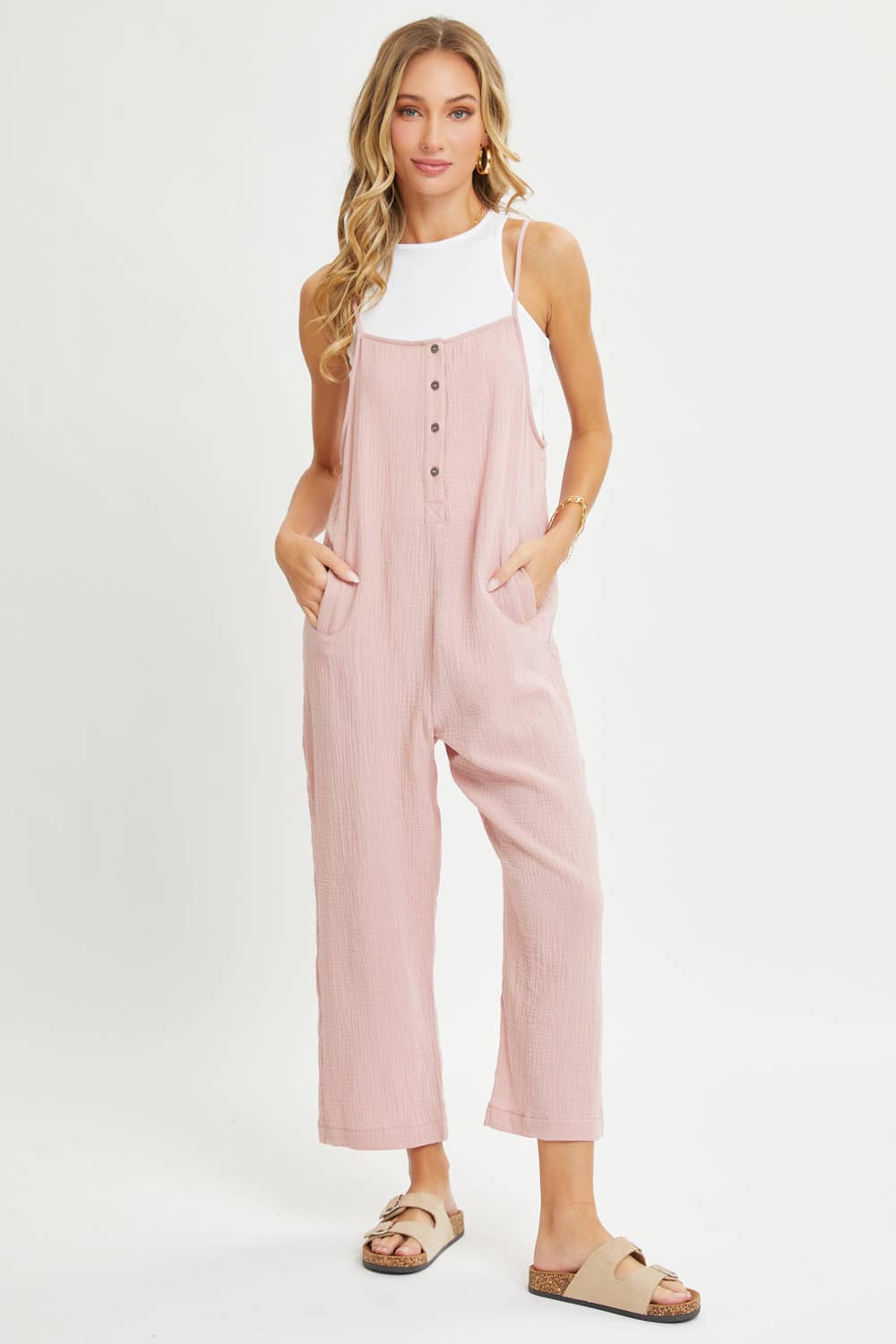 Comfy Sleeveless Jumpsuit in Soft Cotton Gauze - Fasten up in style with this laid-back number. Easy to wear with a versatile silhouette, this piece is perfect for everyday chillin'. Plus, it's got all the deets you need for a perfect fit and feel - adjustable straps, front buttons, and side pockets. And did we mention it's made of 100% cotton?