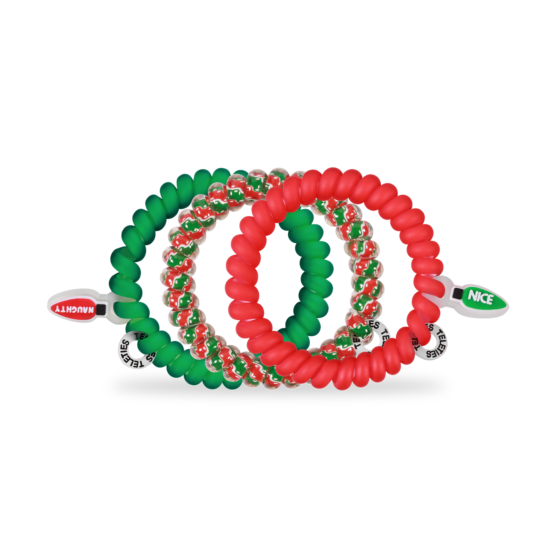 Naughty or Nice Small Hair Ties in Red and Green offer a strong grip without damage, doubling as a chic wrist accessory when not in use. Your new favorite hair essentials all year round. Strong grip, no rip design for all-day hold Doubles as a stylish bracelet Durable and waterproof for all occasions Gentle on hair—prevents breakage, headaches, and creases Sold in packs of three.