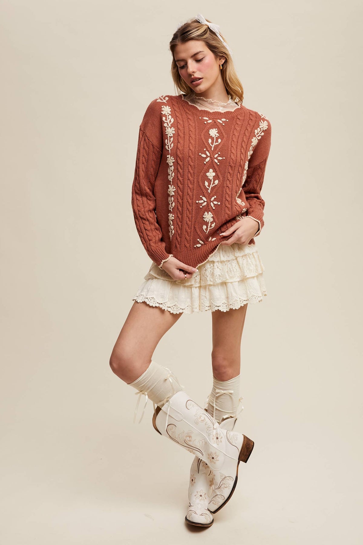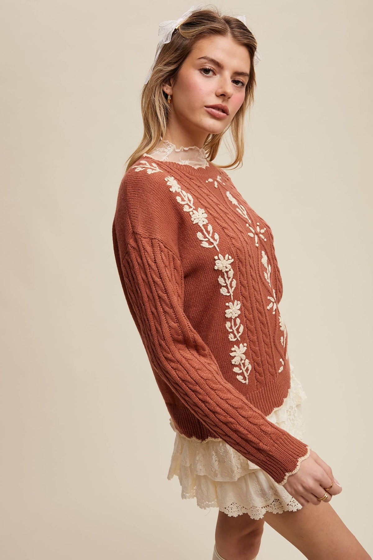 Wrap yourself in this enchanting terracotta sweater that marries comfort with whimsical charm. The mid-weight cable knit provides satisfying warmth and texture, while cream floral embroidery dancing across the front and sleeves brings a handcrafted, romantic flair. A relaxed fit makes layering effortless, and the scalloped hem adds a delightfully vintage touch. Ribbed detailing at the cuffs, neckline, and hem keeps everything perfectly in place. Slip it on over your favorite tee for instant cottagecore appeal—cozy, sweet, and undeniably stylish.