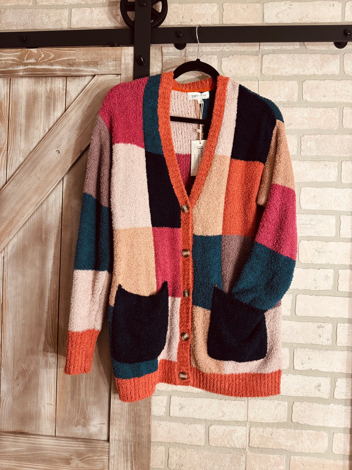 Stay wrapped up in the clouds this season with the all new Cloud Patchwork Cardigan! Featuring a gorgeous patchwork of jewel toned squares and fun, chunky buttons, this cardigan gives you an ultra cozy feel you’ve come to love from our “cloud” line! Trust us - you won’t want to leave home without it!
