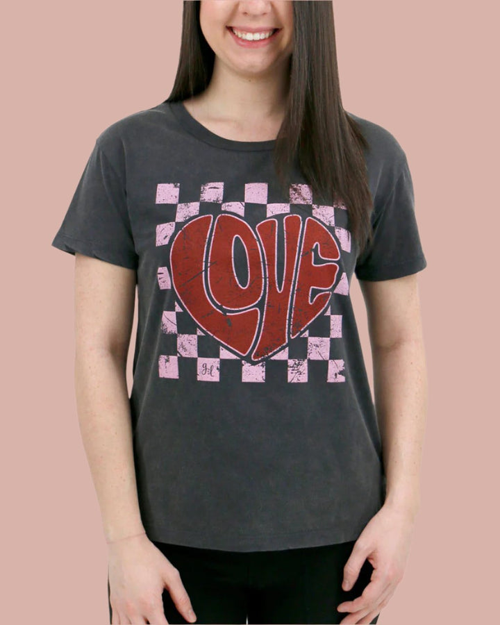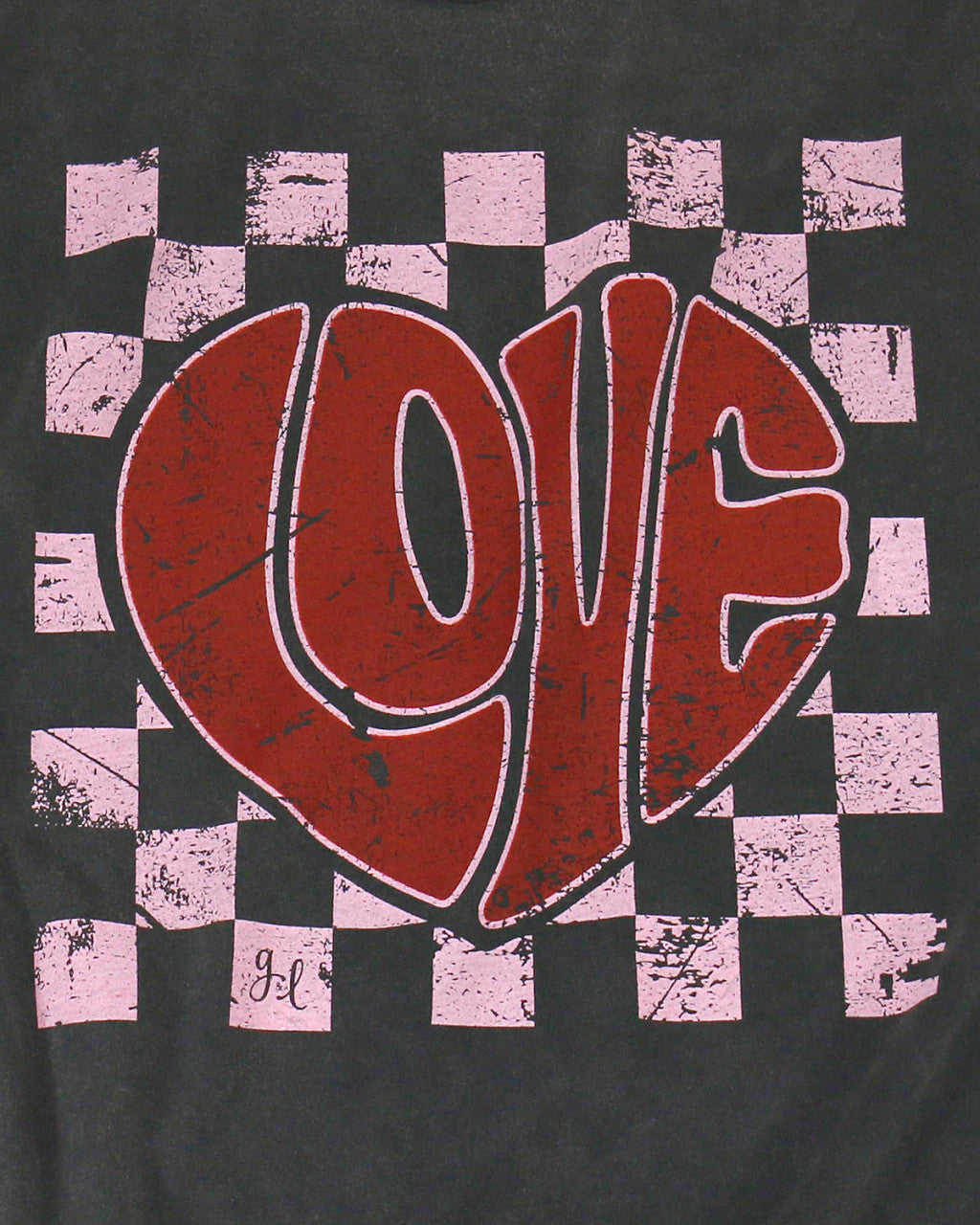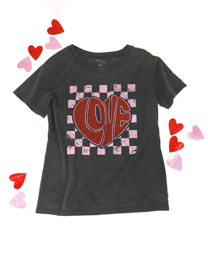 •Trendy checkered heart “love” graphic print with throwback vintage vibes perfect for now and any time of year!