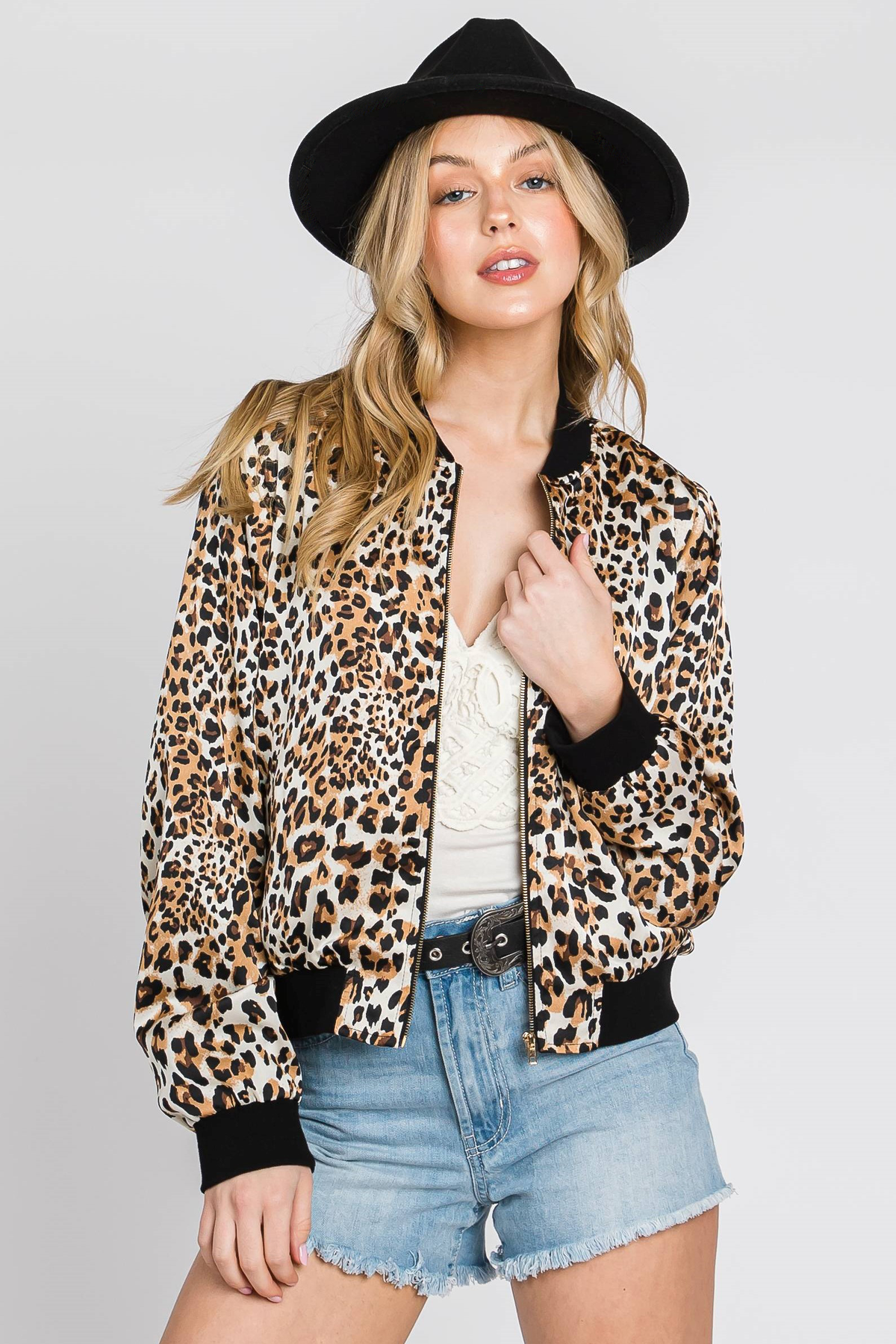 Bring a wild twist to your wardrobe with the Leopard Satin Bomber Jacket 3194T. Featuring a smooth satin finish with a bold leopard print, this jacket plays up your fun side effortlessly. Ribbed details on the cuffs and hem add a sporty edge, while the fully lined interior ensures comfy all-day wear. Practical pockets keep essentials close, and its flattering 21 1/2" length with a 40" chest fit makes it perfect for layering over your favorite outfits. Step out in style and confidence with this playful statement piece that’s as fierce as you are.