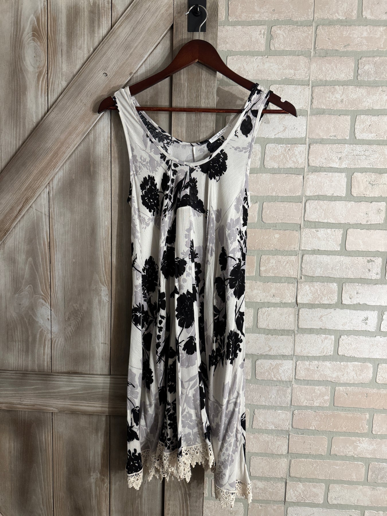 Bring a touch of timeless charm to your wardrobe with this stunning black and cream floral dress. Featuring a soft, flowy silhouette with a flattering drape and delicate lace trim at the hem, this piece blends comfort with effortless elegance. Perfect for layering under a denim jacket or pairing with boots for a dreamy, boho-chic look.