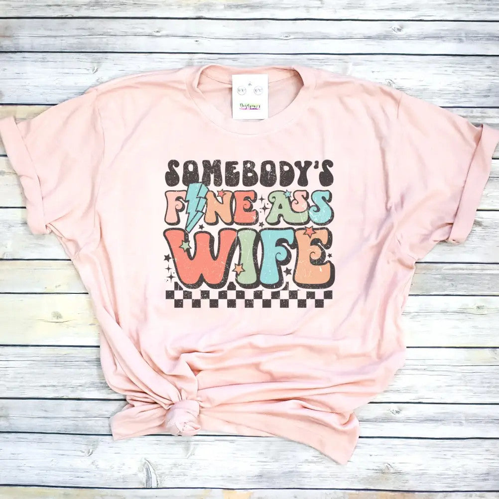 Celebrate your status with the Somebody's Fine Ass Wife Graphic Tee! This playful light pink shirt features a soft blend of 65% polyester and 35% cotton, offering a comfortable unisex fit perfect for everyday wear. Whether you're out with friends or just lounging at home, this tee adds a fun, confident vibe to your look while keeping you cozy all day long.