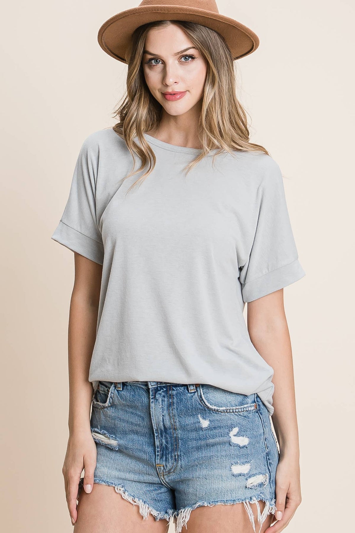 This is a versatile and timeless women's basic t-shirt, designed for everyday comfort and effortless style. It features a classic crew neckline, short sleeves with stylish banded cuffs, and a relaxed fit that drapes beautifully. Crafted from a soft, breathable fabric, it's perfect for layering or wearing solo with your favorite jeans, shorts, or skirts.