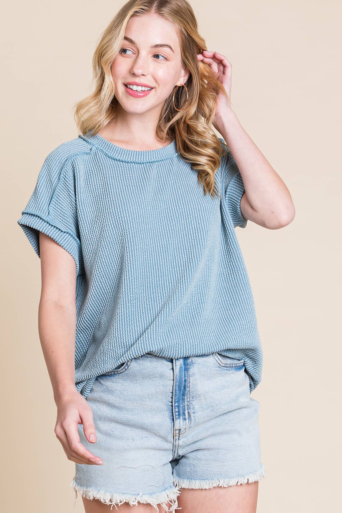 This ribbed knit top delivers a laid-back vibe with its roomy fit, short sleeves, and edgy raw hems. The cozy ribbed fabric keeps things comfy and breathable, perfect for your everyday adventures. Made from 95% Polyester and 5% Spandex, it’s as soft as it is stylish. The 5'8" model rocks a size S. Proudly made in the USA!
